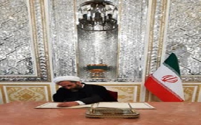 Hujjat al-Islam Faqih Esfandiari, the Deputy of International Relations in Astan Quds Razavi, and Hujjat al-Islam Gonabadi Nejad, the Deputy of Culture, Society, and Pilgrimage of Khorasan Razavi Provincial Government and the Secretary of Pilgrimage Committee, pay their respects to the status of the Martyrs of Service of the Ministry of Foreign Affairs.