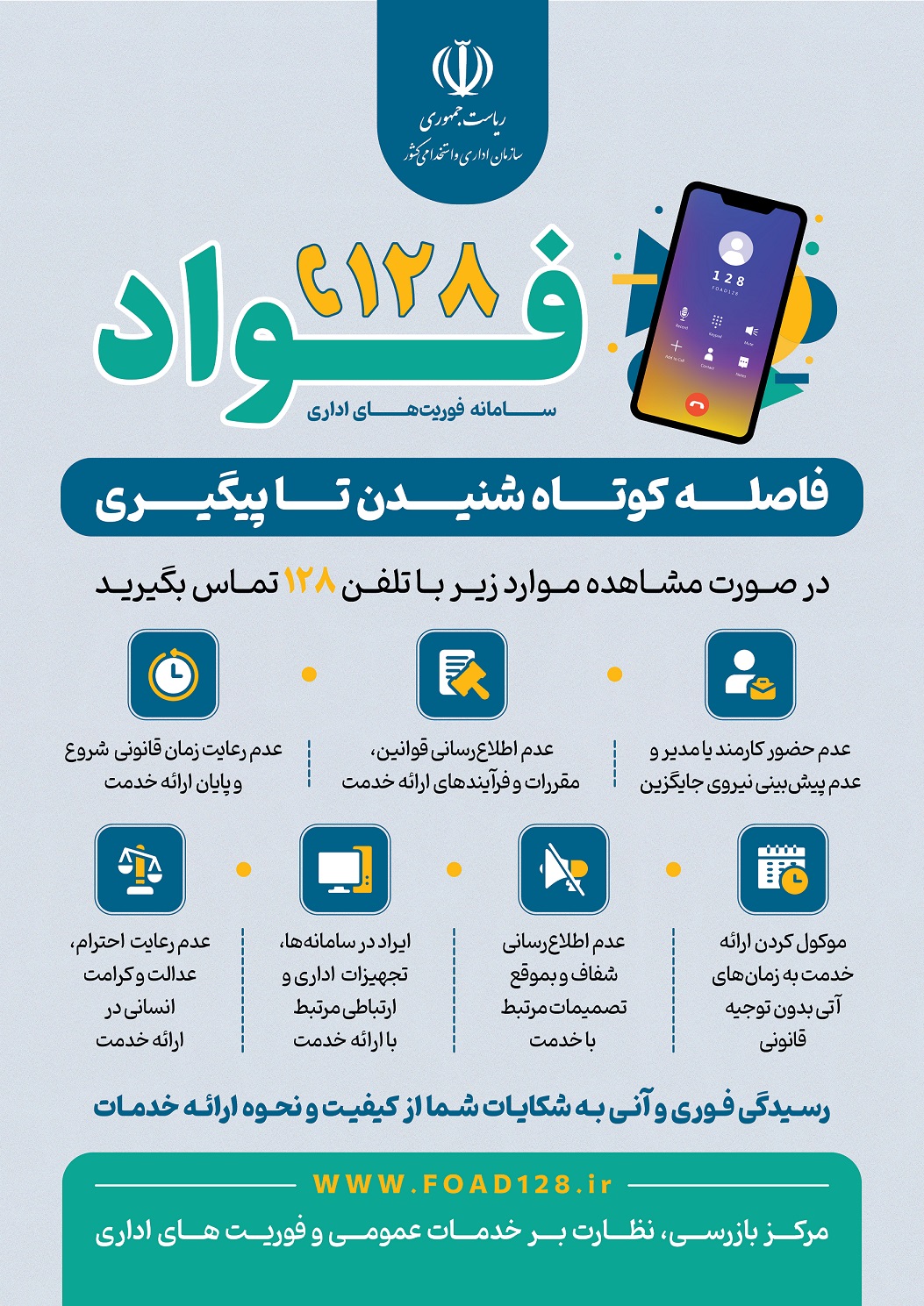 با توجه به اهمیت رسیدگی فوری به امور مراجعین به ادارات دولتی، سامانه فوری رسیدگی به نظرات و شکایات مردمی‌توسط سازمان امور اداری و استخدامی ایجاد و به کلیه دستگاه‌ها،اعلام شده است.   مراجعین محترم نمایندگی‌ها می‌توانند با شماره گیری 128 در داخل کشور و با شماره گیری 989371280000+ نظرات ، پیشنهاد ها و شکایات خود را اعلام نمایند.